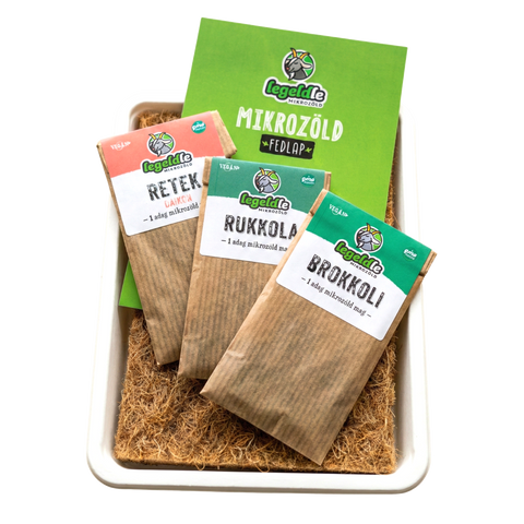Mikrozöld próbacsomag tartalma: 1 tálca, 1 fedlap, 3 rostlap, 3 csomag különböző mikrozöld mag.
